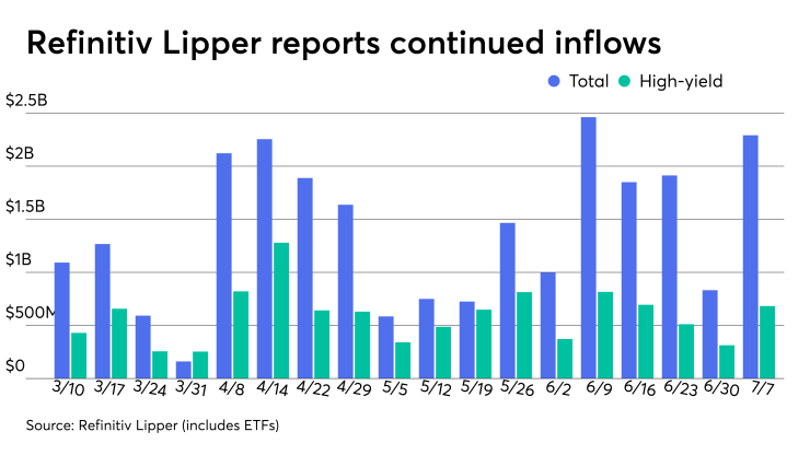 Refinitiv Lipper reported $2.29 billion of inflows into municipal bond mutual funds for the week ending July 7 of which $682.7 million