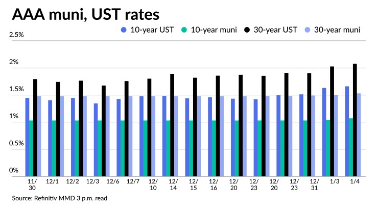 Refinitiv MMD's scale was cut three basis points across the curve at 3 p.m. read: the one-year at 0.20% and 0.30% in 2023. The 10-year at 1.07% and the 30-year at 1.53%.