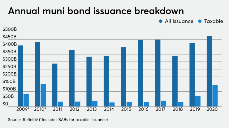 The muni market saw $474.05 billion in 12,940 deals in 2020 compared to $426.35 billion in 11,596 transactions in 2019, according to Refinitiv. It bested the previous record of $448.61 billion hit in 2017.