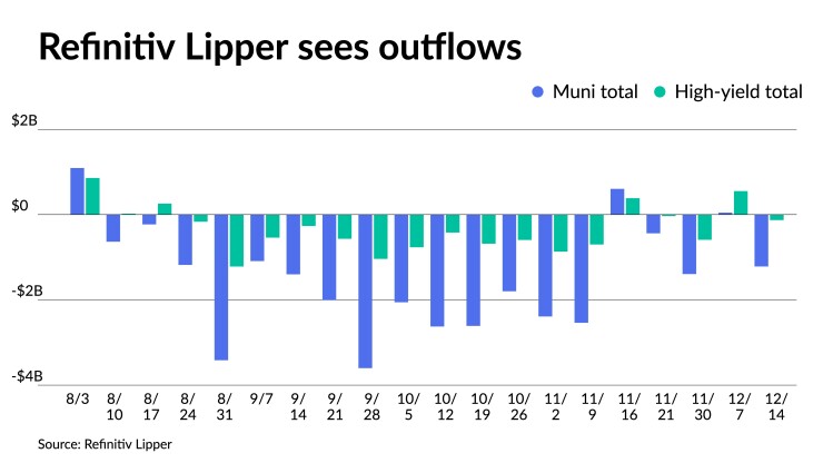 Outflows returned as Refinitiv Lipper reported $1.217 billion was pulled out of municipal bond mutual funds for the week ending Wednesday after $46.912 million of inflows the week prior.