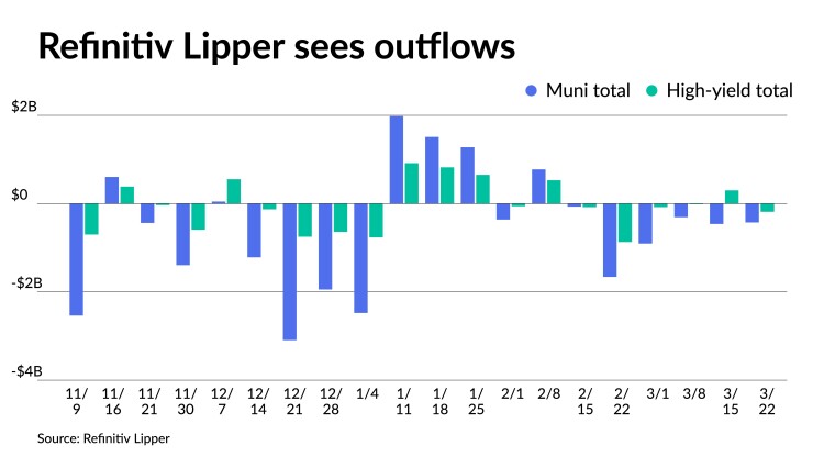 Refinitiv Lipper reported $427.082 million of municipal bond mutual fund outflows for the week that ended Wednesday following $461.123 million of outflows the previous week.