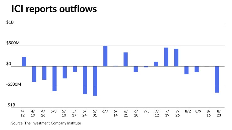 The Investment Company Institute reported investors pulled $636 million from municipal bond mutual funds in the week ending Aug. 23, after $3 million of outflows the previous week. ETFs saw inflows of $21 million after $168 million of outflows the week prior.