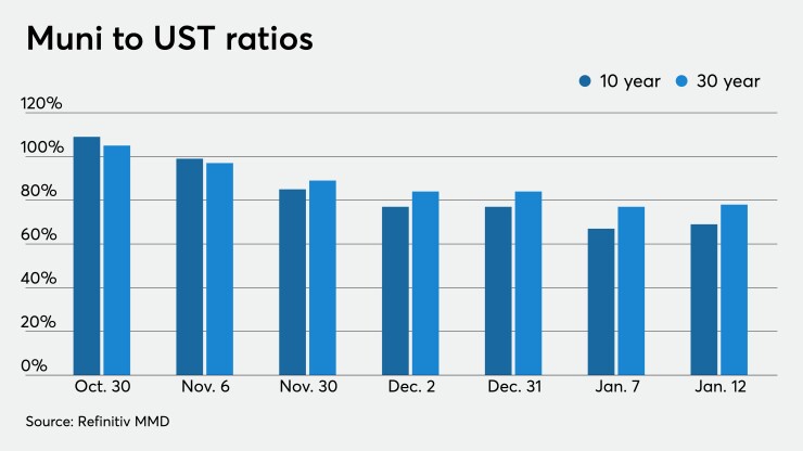 On Tuesday, the municipal to Treasury ratios sat at 69% in 10 years and 78% in 30 years, according to Refinitiv MMD. Ratios were 68% in 10 years and 79% in 30 years, according to ICE Data Services.