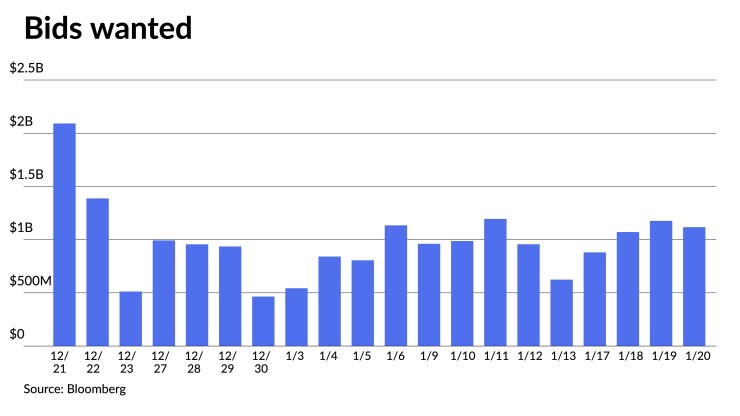 With supply still limited, he said, a high volume of secondary trading should continue. Clients' bids-wanted totaled $4.25 billion last week, per Bloomberg.