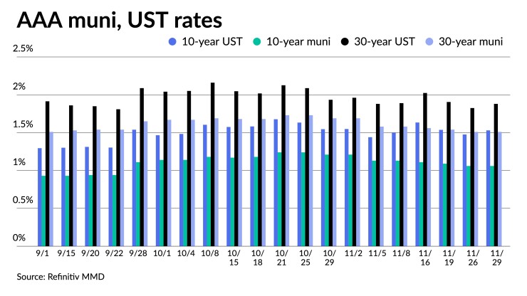 The secondary muni market was lightly traded providing little guidance for triple-A benchmarks as the market awaits a larger calendar to begin the final month of 2021.