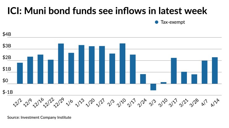 The hearty demand for new issuance underscored the latest flow data as the Investment Company reported $2.289 billion of inflows into municipal bond funds for the week ended April 14.