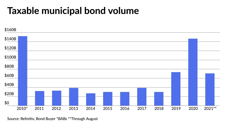 "Our core conclusion is this: with a BABs program, the taxable market would grow into the dominant form of issuance, albeit slowly at some times and quickly at others," the July report said. "Our model output shows that more generous subsidies and higher yield ratios (i.e., relative tax-exempt to taxable yields) drive a sharp increase in expected taxable supply."