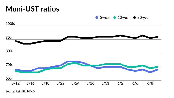 The two-year muni-Treasury ratio Friday was at 64%, the three-year at 66%, the five-year at 68%, the 10-year at 69% and the 30-year at 90%, according to Refinitiv MMD's 3 p.m. read. ICE Data Services had the two-year at 66%, the three-year at 68%, the five-year at 68%, the 10-year at 70% and the 30-year at 92% at 4 p.m.