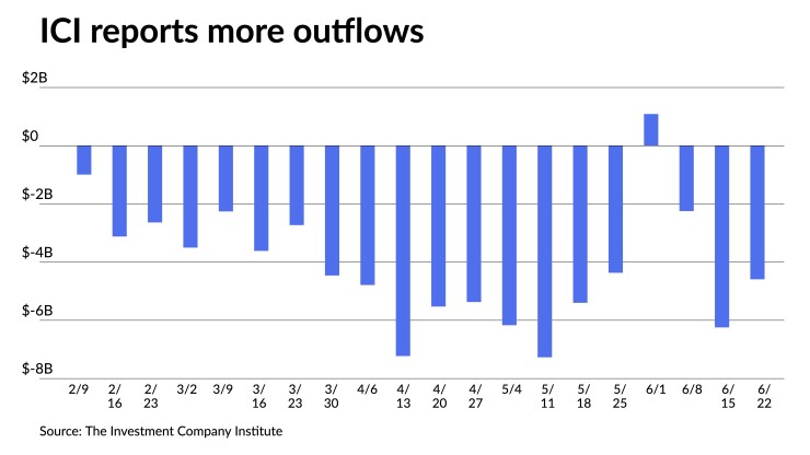 The Investment Company Institute reported investors pulled $4.590 billion from muni bond mutual funds in the week ending June 22, down from $6.243 billion of outflows in the previous week. This brings the total to $86.4 billion of outflows year-to-date versus Refinitiv Lipper's $45.7 billion figure.