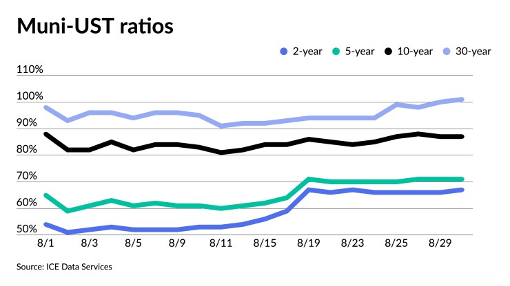 The two- and three-year muni-UST ratios are around 65% to 67%. The five-year was at 71%, the 10-year at 83% and the 30-year at 102%, according to Refinitiv MMD's 3 p.m. read. ICE Data Services had the five at 71%, the 10 at 87% and the 30 at 101% at a 4 p.m. read.