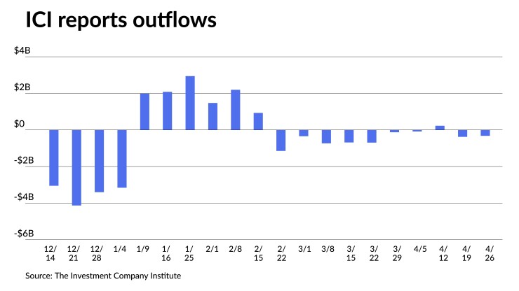 Meanwhile, the Investment Company Institute reported investors pulled $323 million from to mutual funds in the week ending April 26, after $377 million of outflows the previous week. Exchange-traded funds saw inflows of $706 million after $716 million of outflows the week prior, per ICI data.