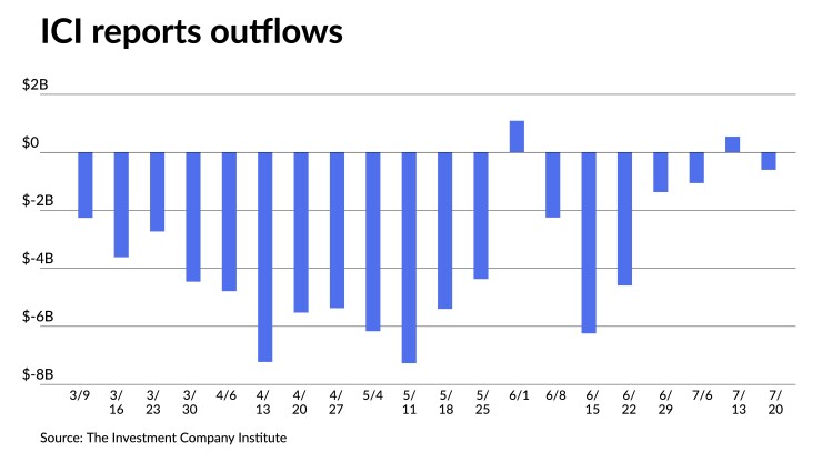 The Investment Company Institute reported investors pulled $602 million out of muni bond mutual funds in the week ending July 20 compared to the $543 million of inflows in the previous week.