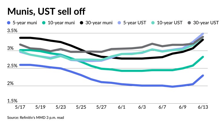 "This particular move today (and really, the pain we've had since the start of the year) is unfortunate for this market because it is not based on the asset class itself," the New York strategist said. "It's purely a UST/Fed/inflation-led selloff. Retail is scared. CPI shook the markets Friday and faith in the Fed is faltering. It's an all-out selling rampage out there and munis are being swept along."