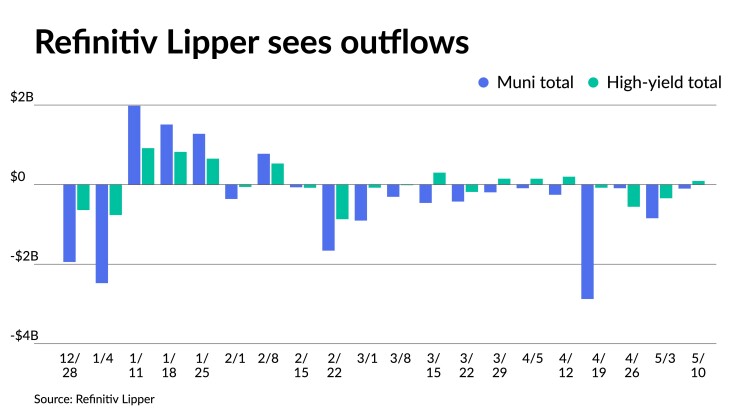 Outflows were seen again from municipal bond mutual funds, though they lessened this week as Refinitiv Lipper said $101.664 million was pulled as of Wednesday after $846.116 million of outflows the week prior.