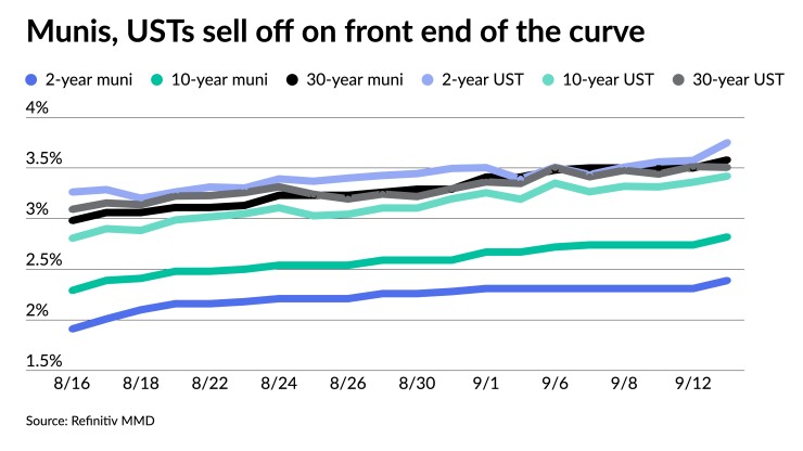 "That cautionary signal from USTs, along with upward pressure on short and intermediate yields following the Fed, is enough to worry municipal investors away from longer purchases despite endemic product scarcity, mostly oversold valuations, and nominal yields re-hitting classic entry points," Fabian said.