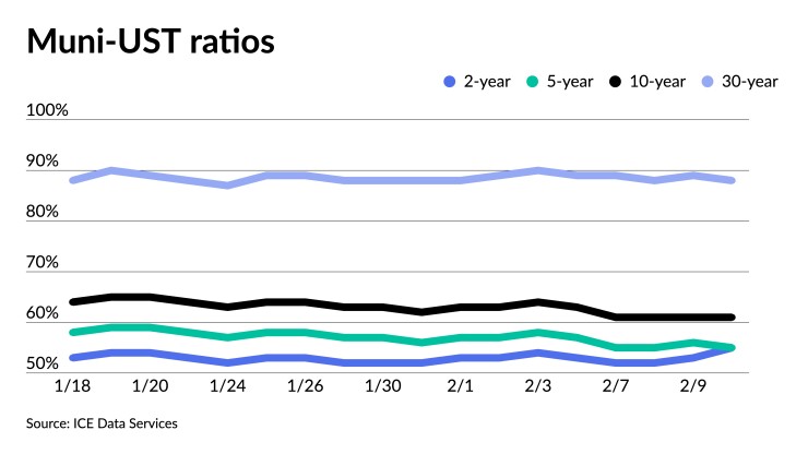The three-year muni-UST ratio was at 53%, the five-year at 54%, the 10-year at 60% and the 30-year at 86%, according to Refinitiv MMD's 3 p.m. ET read. ICE Data Services had the three at 54%, the five at 56%, the 10 at 61% and the 30 at 89% at 4 p.m.