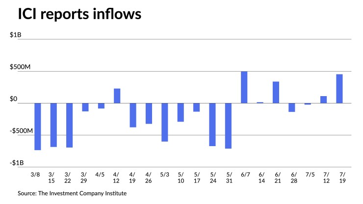 The Investment Company Institute reported investors added $453 million to municipal bond mutual funds in the week ending July 19, after $111 million of inflows the previous week. Exchange-traded funds saw inflows of $1.125 billion after $96 million of inflows the week prior.