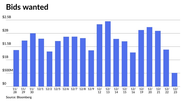 "Although late-year volumes may be smaller, the market tone is holding firm on the premise of no supply/rollover demand — somewhat typical for December but noteworthy for the level of volatility the market has endured," said Kim Olsan, senior vice president of municipal bond trading at FHN Financial.