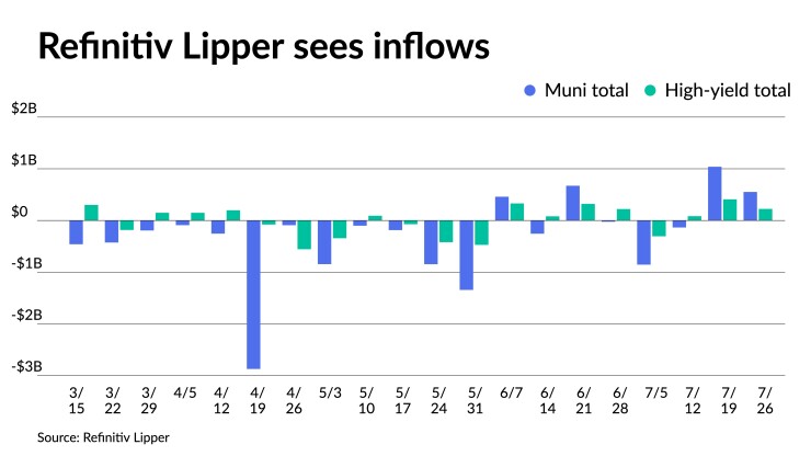 National funds had inflows of $611.918 million after inflows of $1.047 billion the previous week while high-yield muni funds reported inflows of $223.444 million after inflows of $408.477 million the week prior.