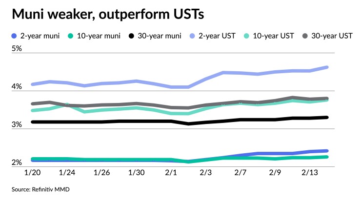 Connecticut 5s of 2024 at 2.36%-2.61% versus 2.29% on 1/25. North Carolina 5s of 2024 at 2.77%. Utah 5s of 2025 at 2.41% versus 2.35% on 2/7.