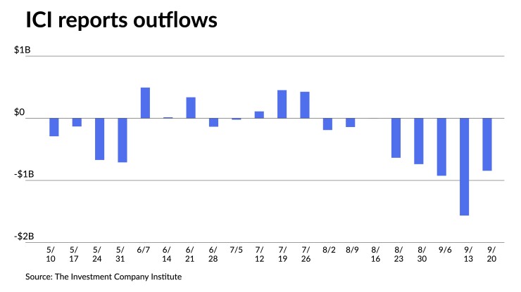 The Investment Company Institute Wednesday reported investors pulled $845 million from municipal bond mutual funds in the week ending Sept. 20 after $1.566 billion of outflows the previous week. For the most recent reporting week, ETFs saw inflows of $462 million after $852 million of inflows the week prior, according to ICI.
