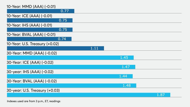 The IHS Markit municipal analytics AAA curve showed yields at 0.14% in 2022 and 0.15% in 2023 while the 10-year fell two basis points to 0.75% and the 30-year yield at 1.44%, also two lower.
