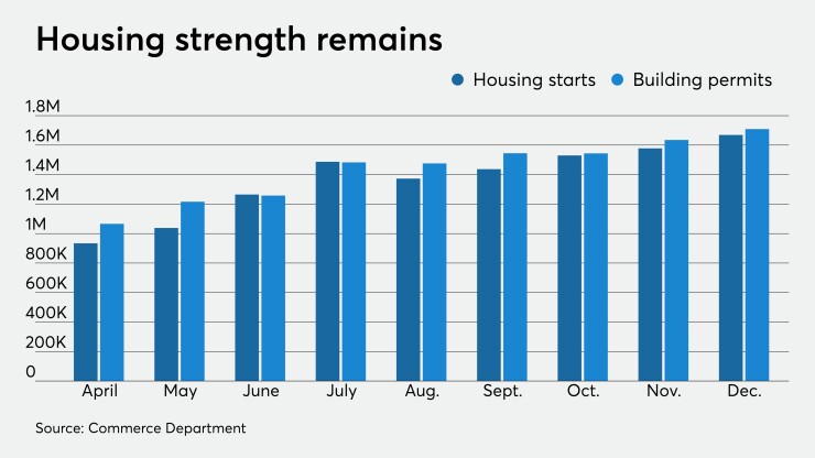 Housing starts gained 5.8% to a seasonally adjusted 1.669 million unit annual rate in December from 1.578 million in November, while permits rose 4.5% to 1.709 million from 1.635 million a month earlier.