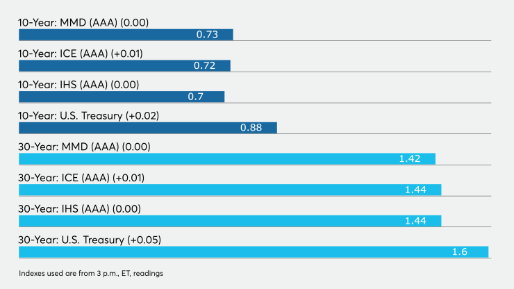 The ICE AAA municipal yield curve showed short maturities rising by one basis point to 0.15% in 2021 and 0.16% in 2022. The 10-year maturity rose one basis point to 0.72% and the 30-year yield gained one basis point to 1.44%.