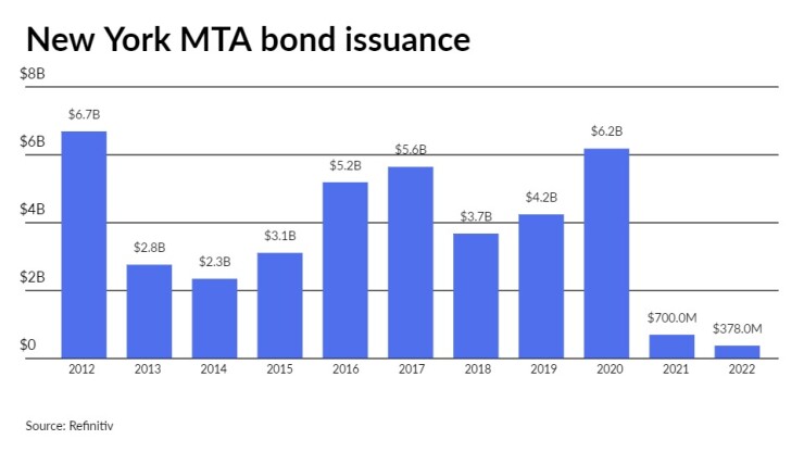 Since 2012, the MTA has sold almost $41 billion of bonds, with the most issuance occurring in 2012 when it offered $6.7 billion and the least in 2022 when it sold $378 million.