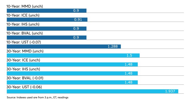 The IHS Markit municipal analytics curve saw the one-year steady at 0.07% and the two-year at 0.08%, with the 10-year steady at 0.90%, and the 30-year yield at 1.48%.