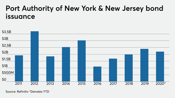 S&P Global Ratings downgraded the Port Authority’s bond ratings one notch to A-plus from AA-minus in June citing plummeting usage levels at all its transportation assets during the pandemic. The Port Authority’s debt is rated Aa3 by Moody’s Investors Service and AA-minus by Fitch Ratings. It has about $23 billion of outstanding consolidated bonds and notes.
