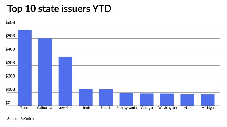Issuers in the Lone Star State accounted for $56.586 billion, up 20.5% year-over-year. California was second with $50.124 billion, up 10.4%. New York was third with $36.435 billion, down 22.1%, followed by Illinois in fourth with $12.551 billion, up 7.3%, and Florida in fifth with $12.162 billion, a 21.8% decrease from 2022.