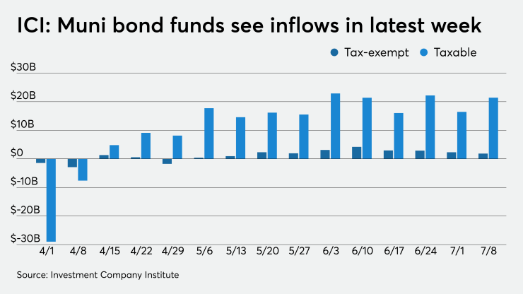 Long-term municipal bond funds and exchange-traded funds saw combined inflows of $1.844 billion in the week ended July 8, ICI reported Wednesday.