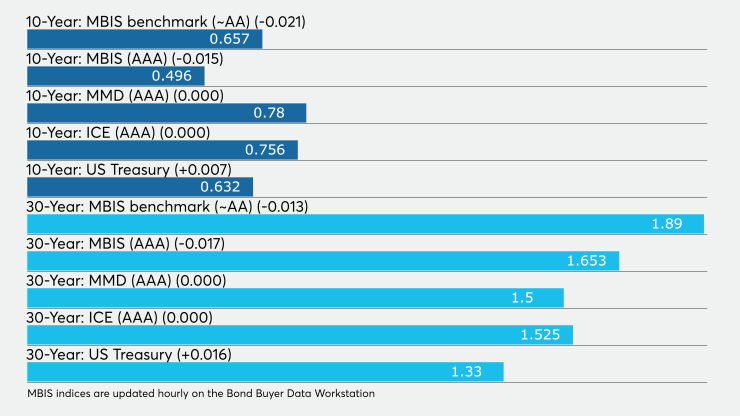 The BVAL AAA curve showed the 2021 maturity yielding 0.17% and the 2022 maturity at 0.20%, while the 10-year muni was at 0.76% and the 30-year stood at 1.53%, all unchanged.