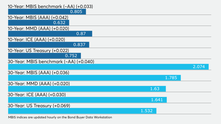 The IHS Markit municipal analytics AAA curve showed the 2021 maturity yielding 0.20% and the 2022 maturity at 0.25% while the 10-year muni was at 0.85% and the 30-year stood at 1.62%.