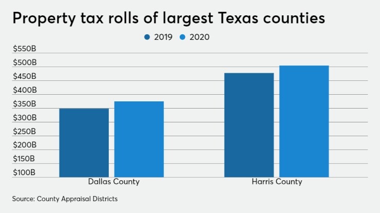 This year, Harris County, the state’s largest, saw a 5.7% increase in value. Single-family homes made up 41% of the county’s tax base, apartments were about 11%, and commercial properties other than apartments made up approximately 26%. The total taxable value of residential properties increased 3% compared with 2019; the taxable value of apartments increased 21% and commercial properties increased 9%.