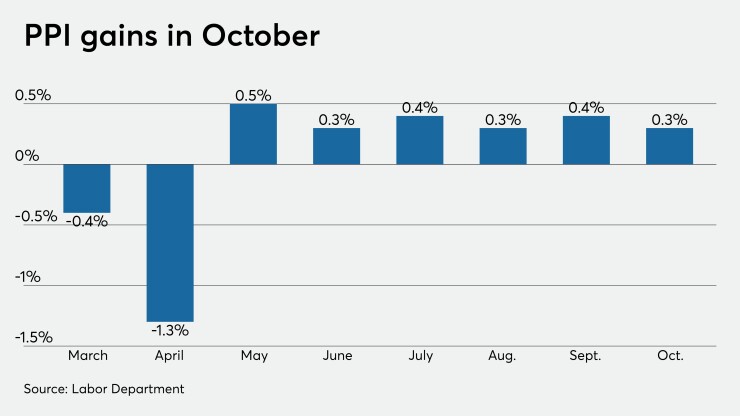 The producer price index rose 0.3% in October, after a 0.4% rise in September, while the core PPI, which excludes food and energy, rose just 0.1% in the month, after a 0.4% a month earlier, the Labor Department reported Friday.