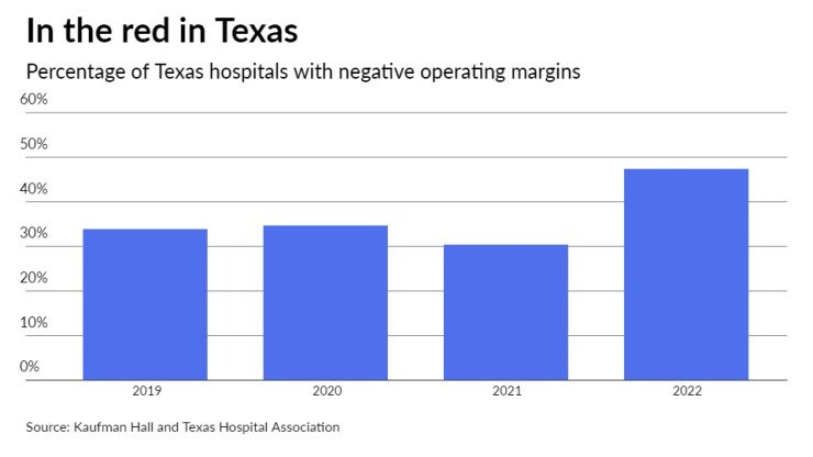 The Kaufman Hall report for the Texas Hospital Association said operating margins are 24.1% below 2019 levels with nearly half of hospitals experiencing negative margins this year, compared to about a third in 2019 as revenue lags the cost of patient care.