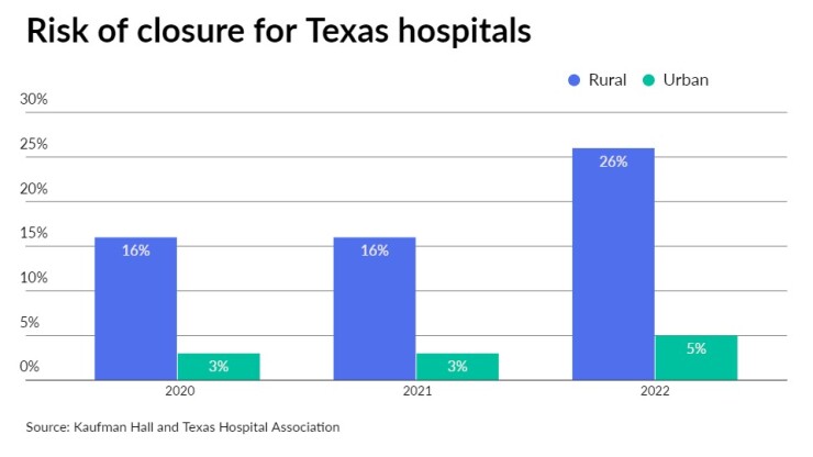 In Texas, the Kaufman Hall report says that rural hospitals have a much higher risk of closure than their urban counterparts.