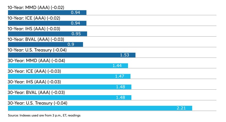 The BVAL AAA curve showed the yield on the 2021 maturity at 0.06% and the 2022 maturity at 0.08%, both down one, while the 10-year fell three basis points to 0.90% and the 30-year fell three to 1.47%