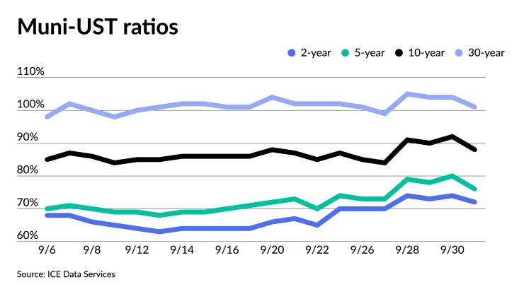 Municipal to UST ratios fell slightly. The three-year on Monday was at 75%, the five-year was at 79%, the 10-year at 88% and the 30-year at 103%, according to Refinitiv MMD's 3 p.m. read. ICE Data Services had the three at 72%, the five at 76%, the 10 at 88% and the 30 at 101% at a 4 p.m. read.