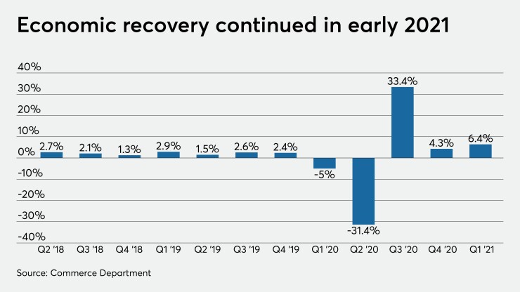 GDP climbed 6.4% in the first quarter on a seasonally adjusted annual basis, according to the advance estimate released Thursday. In the fourth quarter of 2020, GDP gained 4.3%.