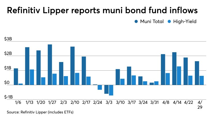 National funds had inflows of $1.597 billion after inflows of $1.801 billion while high-yield muni funds reported inflows of $629.772 million in the latest week, after inflows of $641.783 million the previous week.