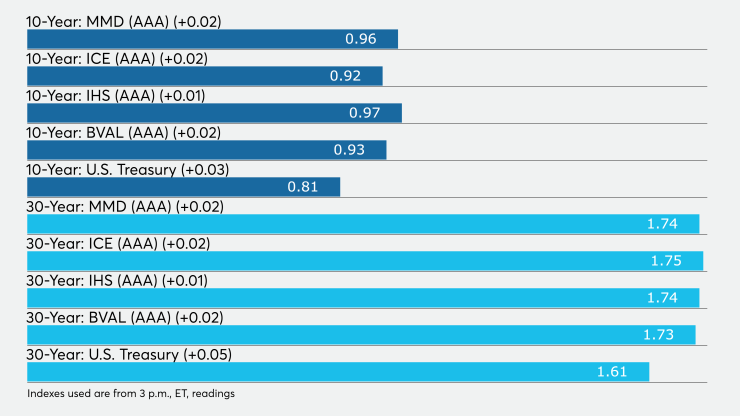 The IHS Markit municipal analytics AAA curve showed short yields up one basis point to 0.15% and 0.16% in 2021 and 2022, respectively, with the 10-year yielding 0.97% and the 30-year at 1.74%.