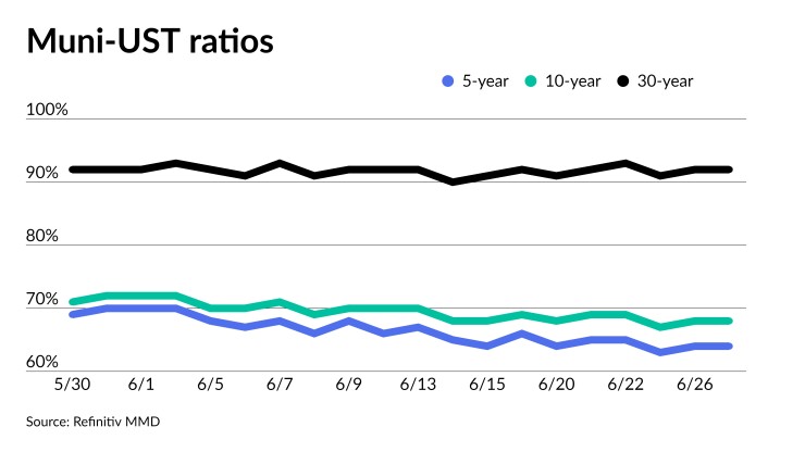 The two-year muni-to-Treasury ratio Tuesday was at 61%, the three-year at 63%, the five-year at 64%, the 10-year at 67% and the 30-year at 90%, according to Refinitiv MMD's 3 p.m. read. ICE Data Services had the two-year at 62%, the three-year at 64%, the five-year at 64%, the 10-year at 68% and the 30-year at 92% at 4 p.m.