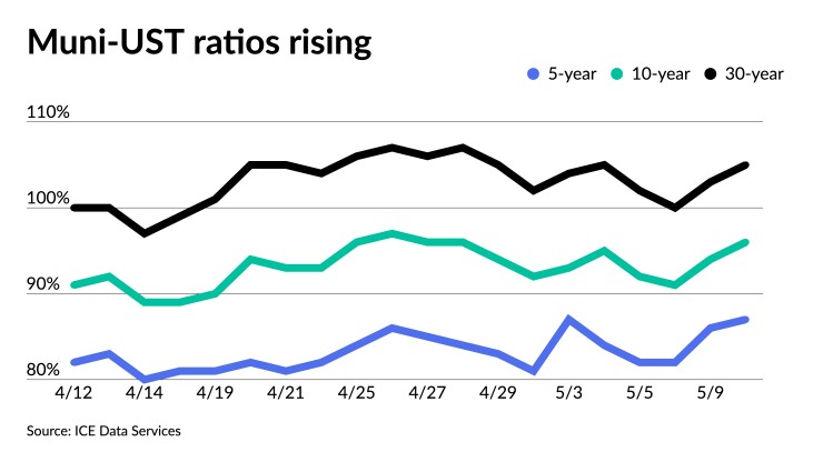 Ratios were at 88% in five years, 96% in 10 years and 103% in 30, according to Refinitiv MMD's 3 p.m. read. ICE Data Services had the five at 86%, the 10 at 94% and the 30 at 103% at a 4 p.m. read.