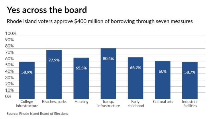 Voters also approved $71.7 million for transportation infrastructure; $15 million for the early childhood care and education capital fund; $7 million for cultural arts and the economy grant program and the state preservation grants program; and, $60 million to fund improvements to industrial site development at Quonset Business Park.