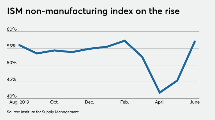 The Institute for Supply Management's non-manufacturing sector index rose to 57.1% in June from 45.4% in May, according to data released Monday by ISM.
