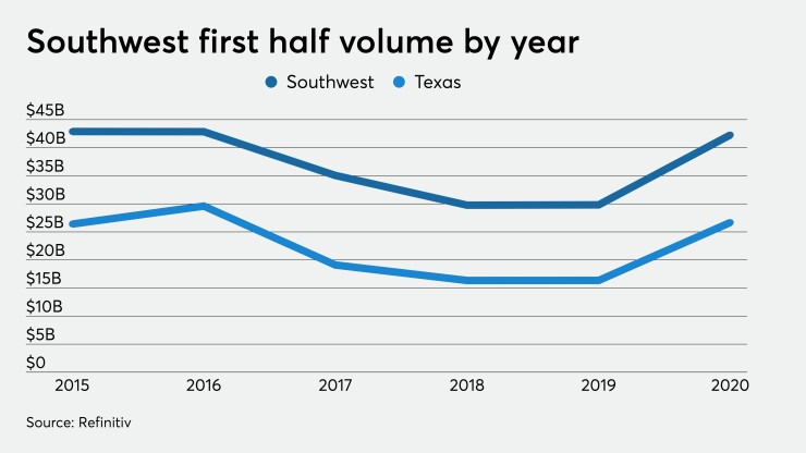 The volume from all Southwest issuers, up 42% from the first half of 2019, was the highest since 2016 with first-quarter growth of 45% and a 39% increase in the second.
