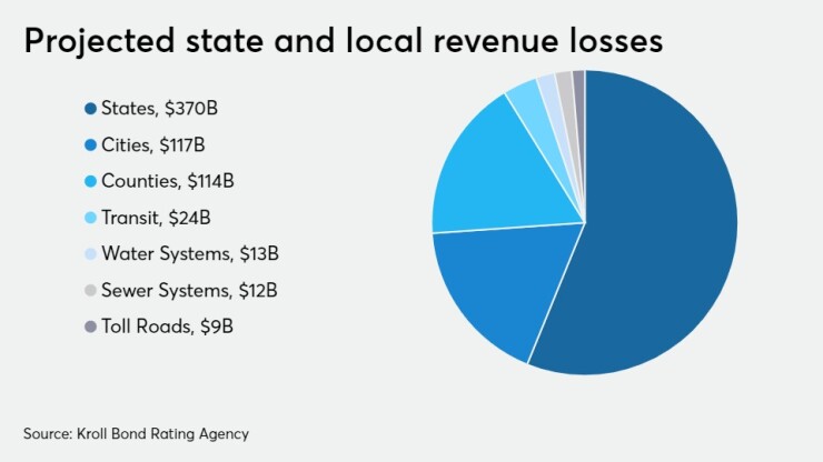 Kroll Bond Rating Agency anticipates losses of $690 billion for state and local governments and agencies through June 30, 2021. States are expected to lose $370 billion, while cities see $117 billion of losses. Counties will miss out on $114 billion while transit agencies lose $24 billion.